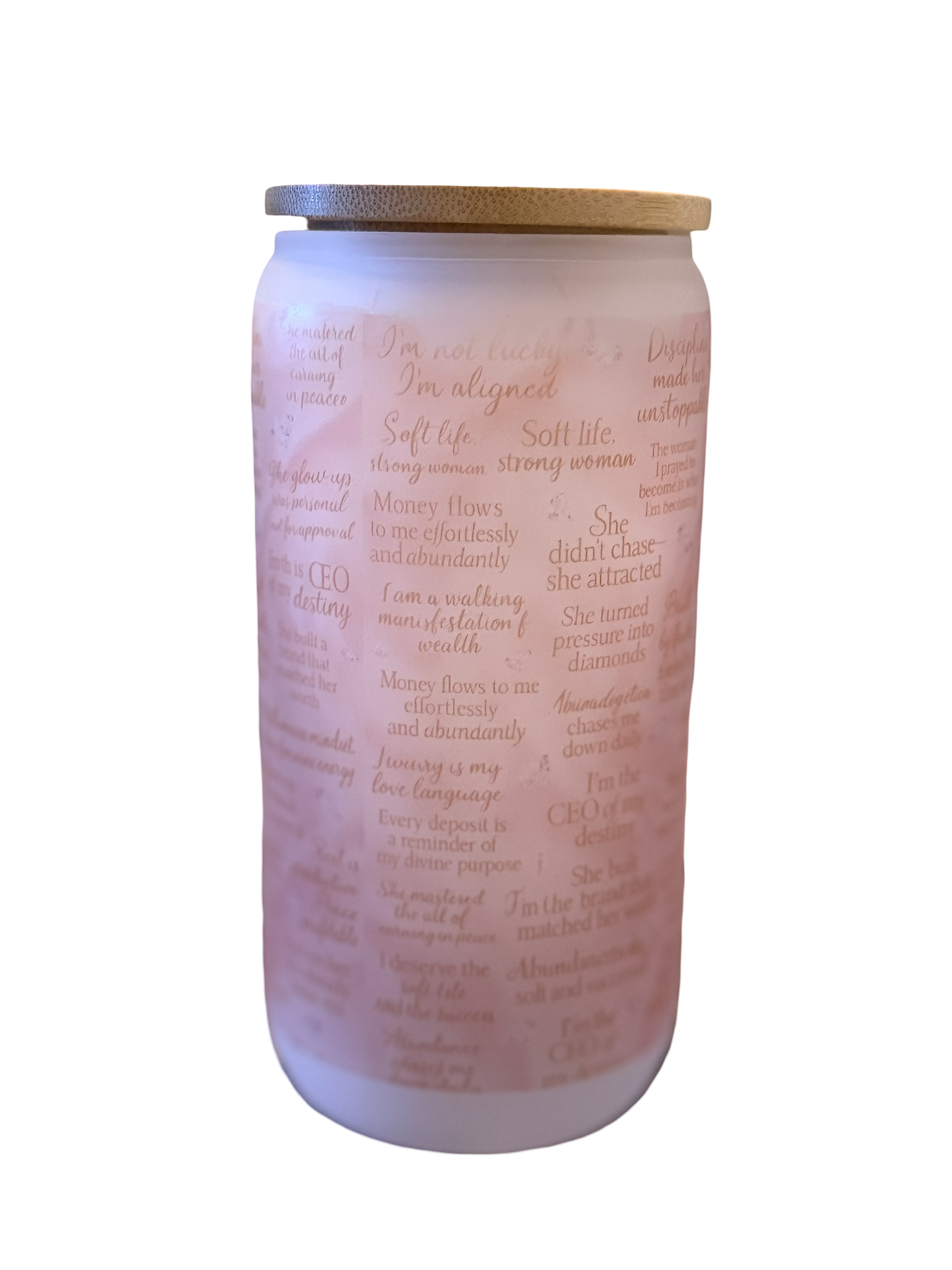 Start every morning with a dose of divine feminine energy. The Boss Babe Affirmation Luxe Frosted Glass Can by Luxe Co. By M.E. was created to remind you who you are — a woman destined for abundance, grace, and unstoppable success.